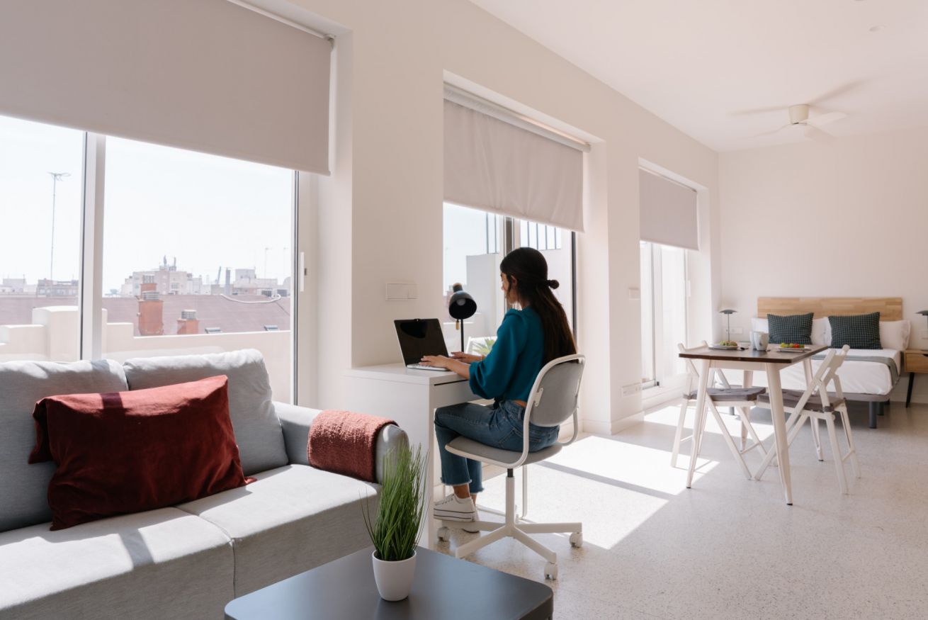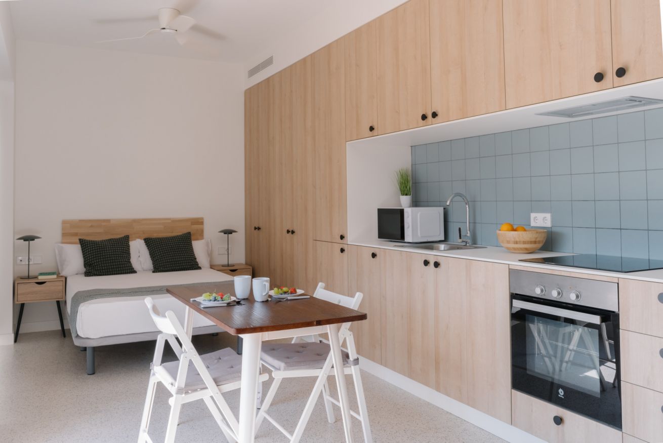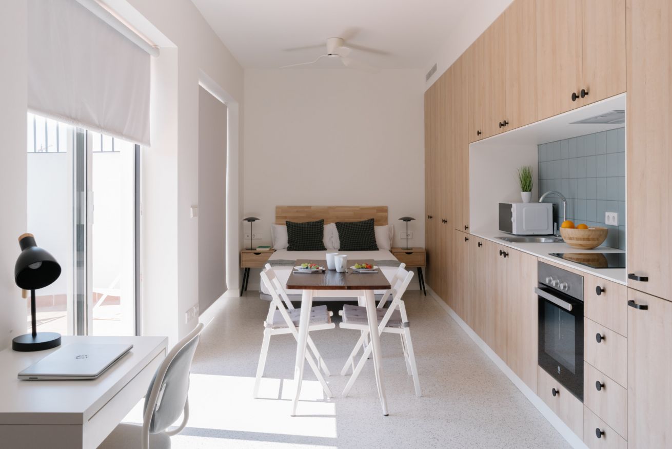 Es un coqueto estudio ubicado en la última planta del edificio que cuenta con una terraza privada donde se pueden disfrutar espectaculares atardeceres valencianos. En el mismo espacio encontrarás una cama de matrimonio, un armario, una cocina americana, un salón-comedor y un escritorio con silla y lámpara para poder trabajar cómodamente desde el estudio. El apartamento está totalmente equipado, contando entre otros con una televisión, aire acondicionado, calefacción central, Wi-Fi rápido, nevera, lavadora, congelador, horno, microondas, tostadora, cafetera y hervidor de agua.