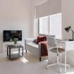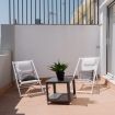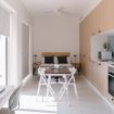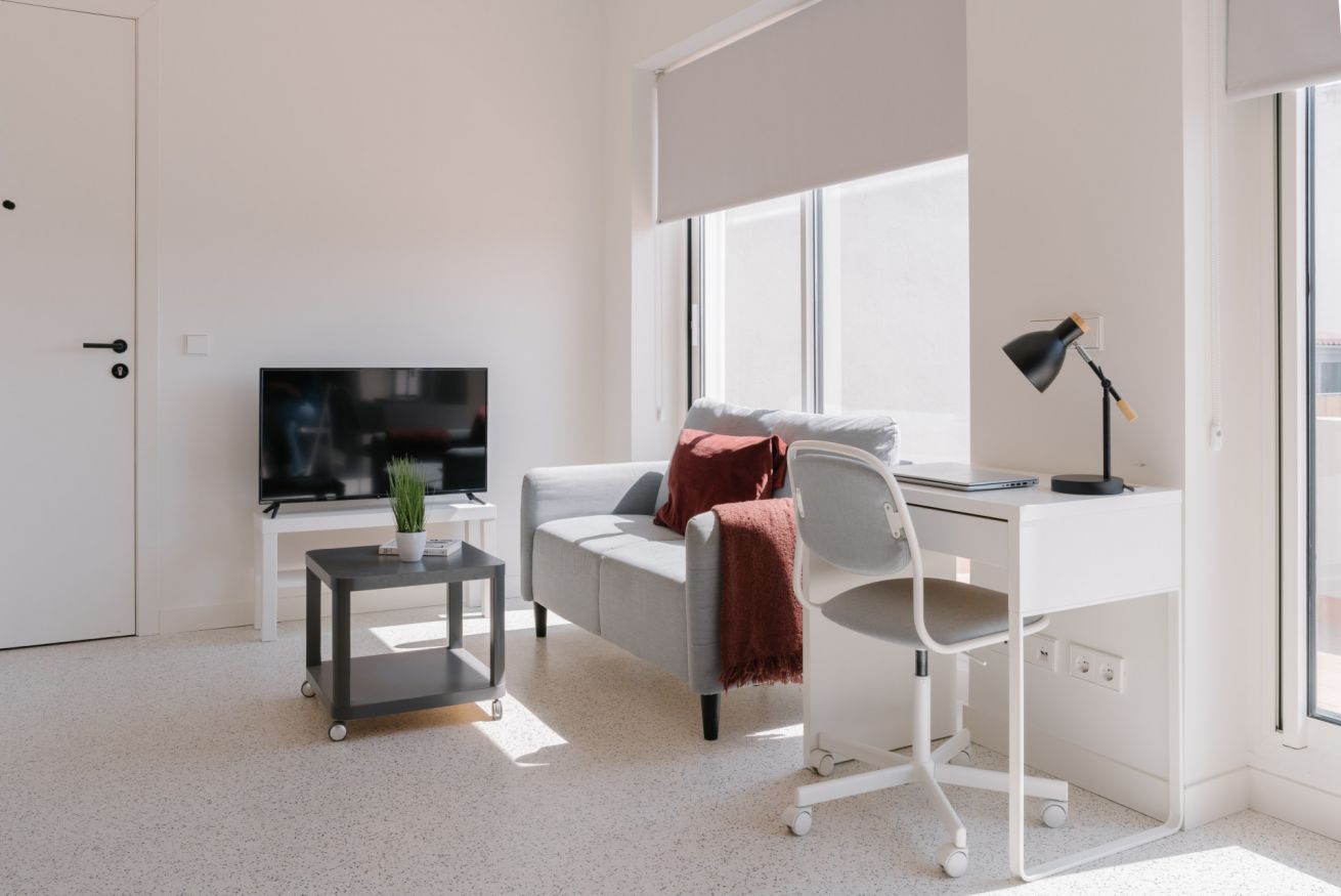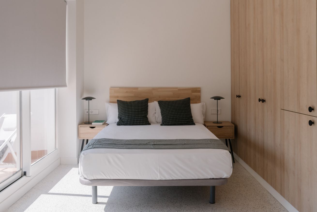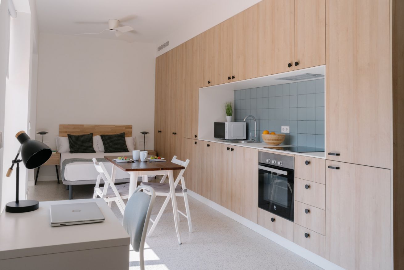 Es un coqueto estudio ubicado en la última planta del edificio que cuenta con una terraza privada donde se pueden disfrutar espectaculares atardeceres valencianos. En el mismo espacio encontrarás una cama de matrimonio, un armario, una cocina americana, un salón-comedor y un escritorio con silla y lámpara para poder trabajar cómodamente desde el estudio. El apartamento está totalmente equipado, contando entre otros con una televisión, aire acondicionado, calefacción central, Wi-Fi rápido, nevera, lavadora, congelador, horno, microondas, tostadora, cafetera y hervidor de agua.