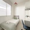 It is a nice flat with two bedrooms (one with a single bed and one with a double bed) and a private patio. Each bedroom has a comfortable bed, bedside table, desk, chair and lamp suitable for working. In addition, the rooms are equipped with a storage space and a window that provides natural light. The flat has a bathroom with the essential furnishings (shower, toilet and washbasin). Finally, the communal kitchen and living room have a modern open-plan concept that guarantees a pleasant stay. A private patio is also at your disposal. The accommodation is fully equipped, including a television, air conditioning, central heating, fast Wi-Fi, fridge, washing machine, freezer, oven, microwave, toaster, coffee maker and kettle.